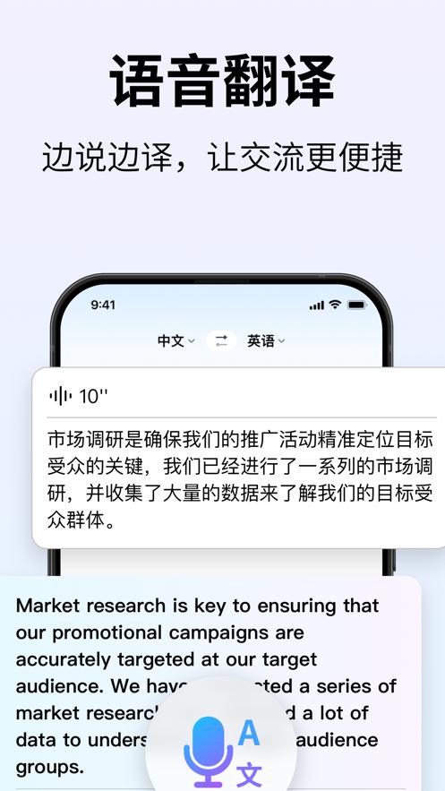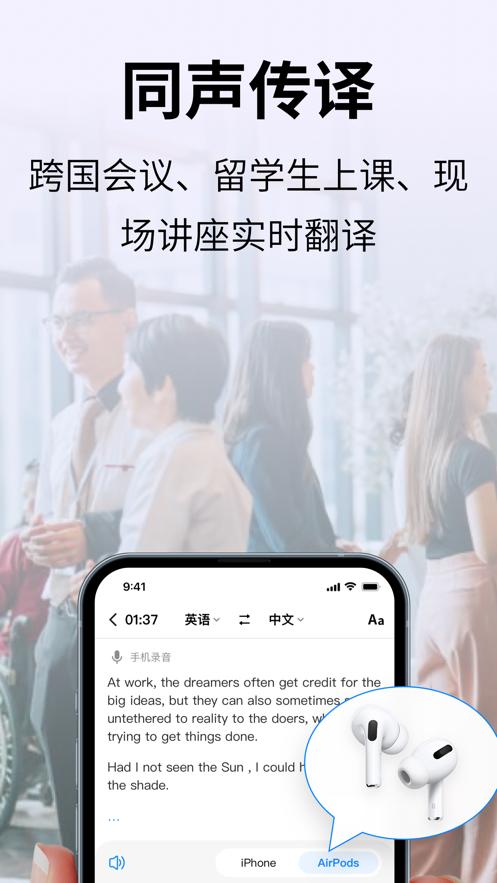 同声传译:通过手机麦克风录音实时翻译外语演讲、现场会议等内容,轻松融入外语环境。