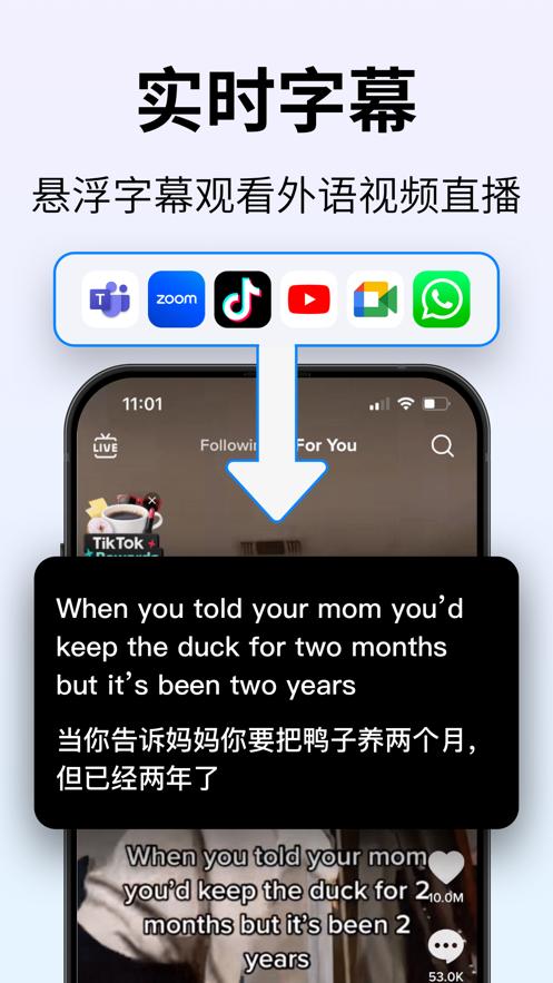 字幕翻译:在使用第三方软件观看视频时,悬浮应用顶层显示实时转写和翻译字幕。