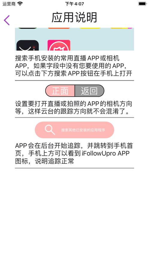 ifollowupro,智能蓝牙追踪云台APP,连线智能云台后点击启动自动追踪,开启您想使用的影像录制APP如系统相机或是直播平台。