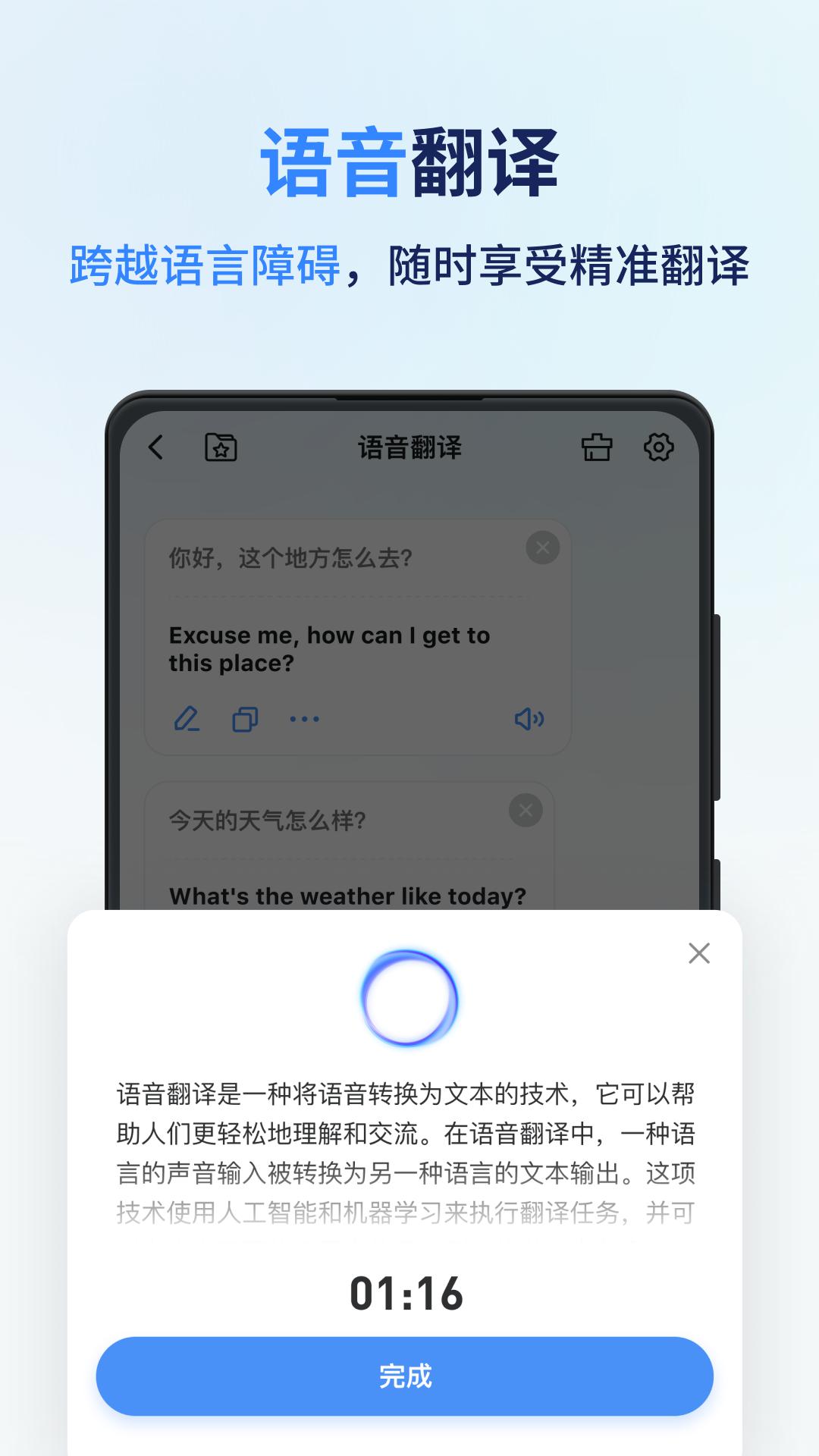 同声传译王软件是一款功能强大的手机翻译工具,软件拥有同声传译,语音翻译,拍照翻译,文档翻译,音视频翻译等等丰富功能,可以帮助用户轻松解决各种翻译难题。