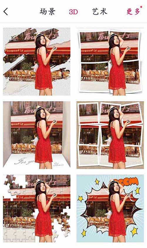 5、这个时候就已经基本大功告成了,如图,已经达成我要的拼图效果,这时候如果想要其他的效果,可以左右滑动图片底部的菜单进行选取,点击更多可以获取更多效果。