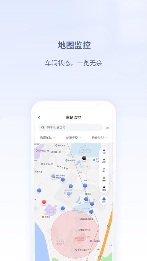 01查看车辆实时位置分布,监测行驶/报警/停车状态,管控车辆运行情况。