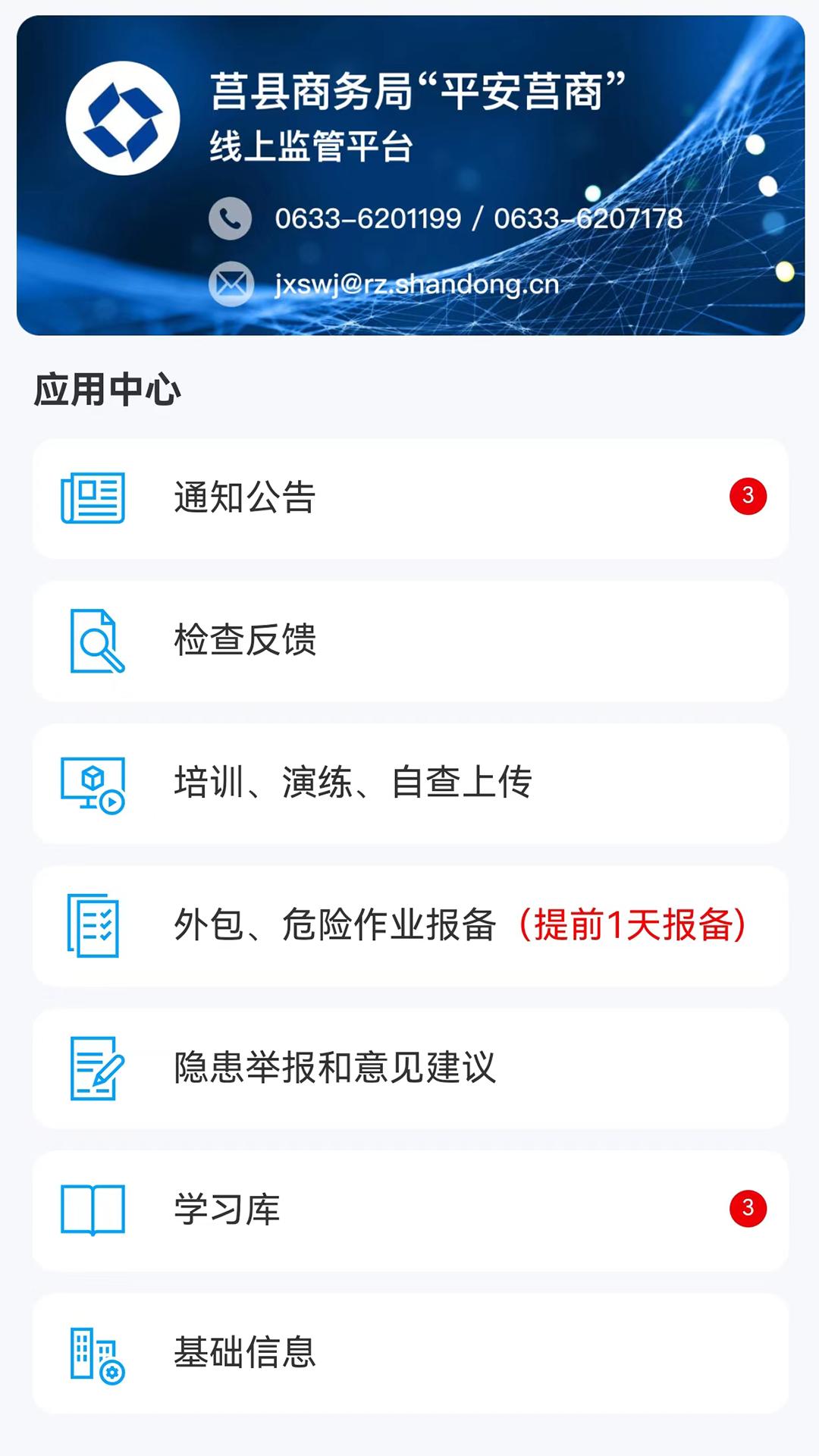 平安莒商app官方下载是莒县商务局官方倾情推出,软件拥有通知公告,检查反馈,培训、演练、自查上传,外包、危险作业报备,学习库等等丰富功能,可以帮助更好的优化管理莒县营商环境。