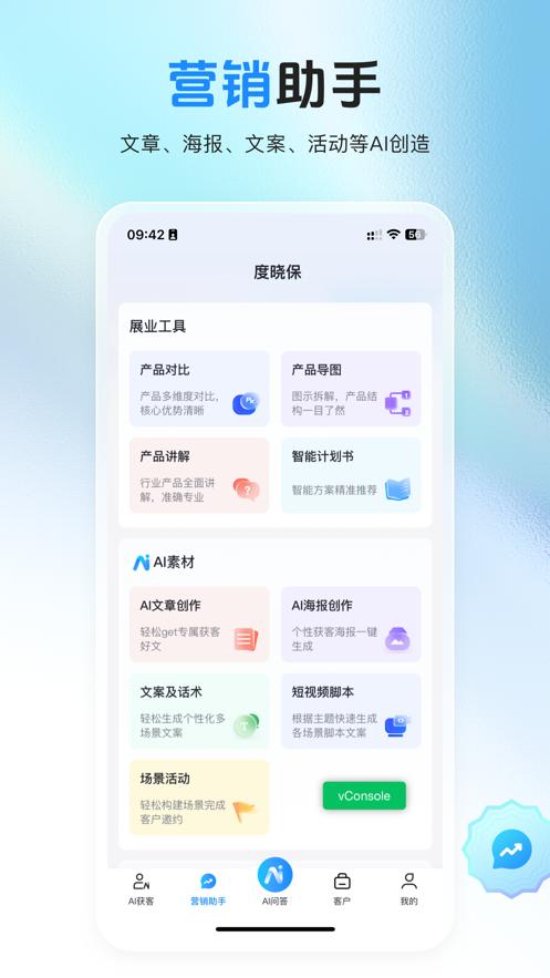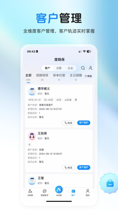 度晓保app是一款为保险销售人员提制作的展业工具,软件拥有客户管理,智能问答,营销助手,AI获客等等丰富功能,可以帮助保险从业者更智慧高效保险工作。