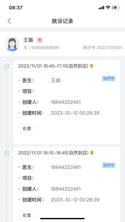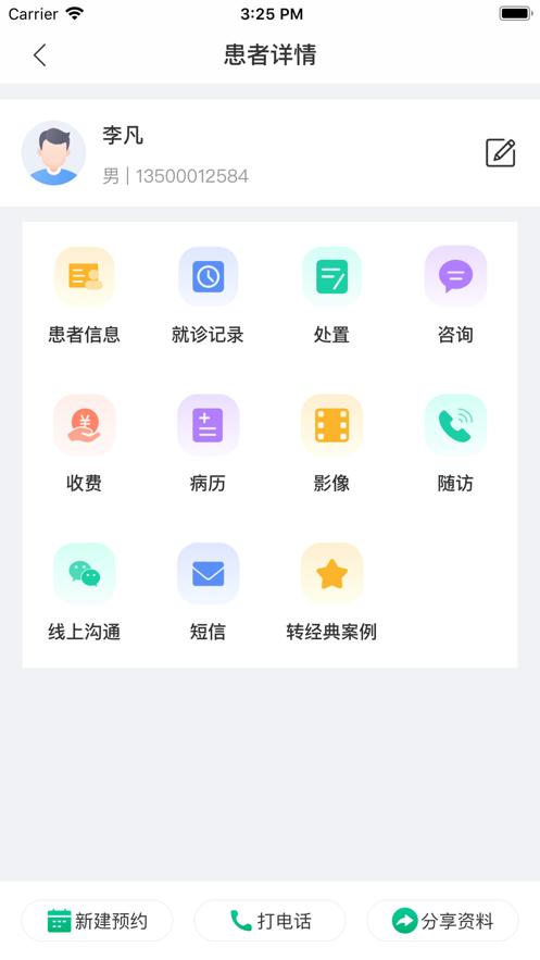 您可以分类查看今日就诊及全部患者信息,并查看其历史就诊、随访等信息。同时移动端还支持对患者进行处置、咨询、收费、书写病历、调阅影像、随访等操作。