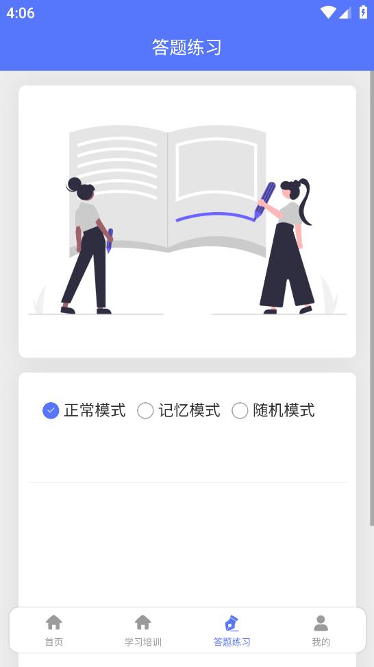 (1)点击页面下方的 “答题练习”,进行行车安全规章和专业知识的练习,可选择 “正常模式” “记忆模式”和 “随机模式” “正常模式” ”下每次进入后会按顺序展示全部试题;“记忆模式”下,系统自动记录学习进度,每次进入后按顺序展示未做的试题; “随机模式”下,系统随机展示所有试题。