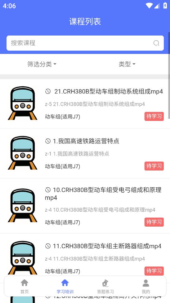 (1)点击页面下方的 “学习培训”即可进入报考机型对应的视频课件,通过“筛选分类”进入行车安全规章和专业知识两个板块,按照知识点顺序学习,页面自动跟踪学习进度,便于学员灵活调整学习计划。学习完该知识点后,点击下方 “课程巩固练习”键跳转到答题练习板块,进行巩固练习,练习结束后可跳转回学习课件继续学习。