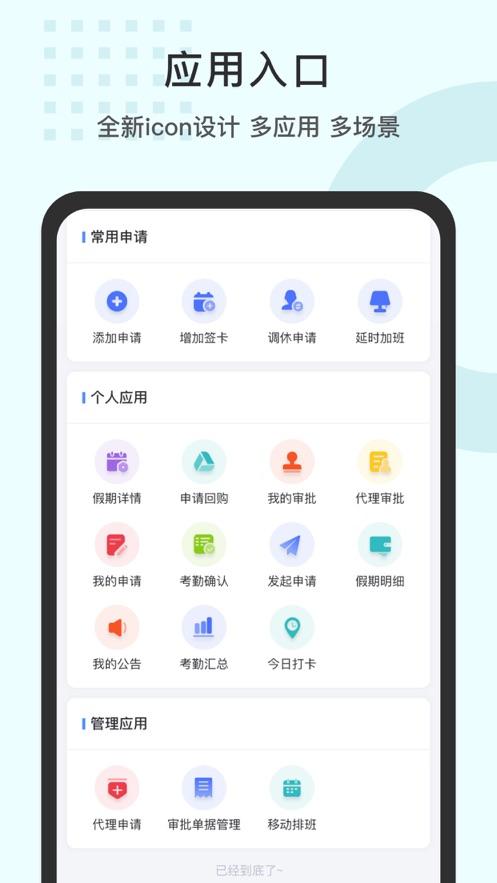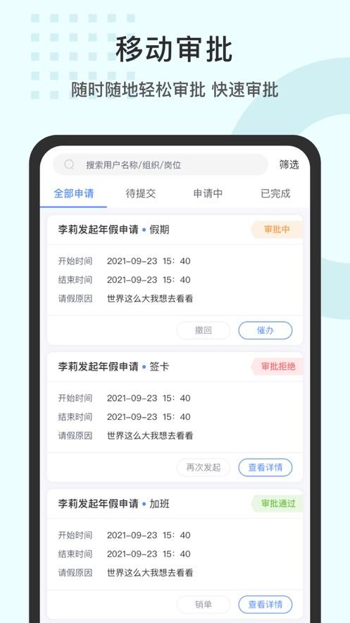 3.员工请假、差勤、加班、补卡、入职、等多种申请、审批;其中的假期政策库帮助企业HR解决各地假期差异问题;