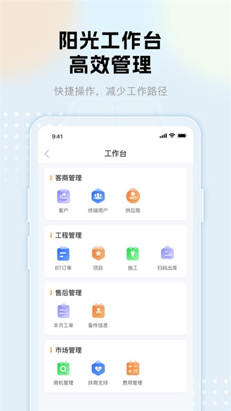 阳光商务云app下载是一款智能光伏服务平台,平台拥有客商管理,工程管理,售后管理,市场管理等等功能服务,可以帮助更好的智能光伏管理,需要的朋友欢迎前来下载使用。