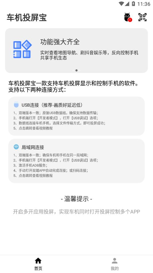 车机投屏宝是一款在汽车车机上投屏显示和反向操控手机屏幕的软件。