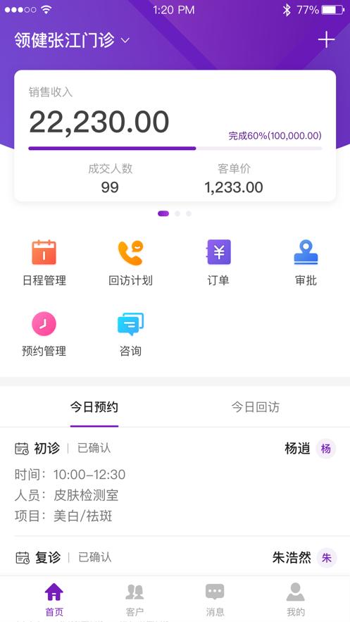 悦容美云帮助医生、前台、医学助理、店长等角色处理:工作审批、报表查看、预约/到店、回访、客户管理、订单管理等工作。