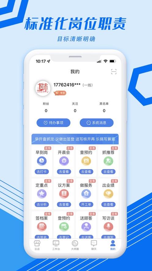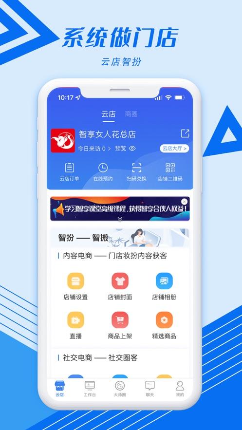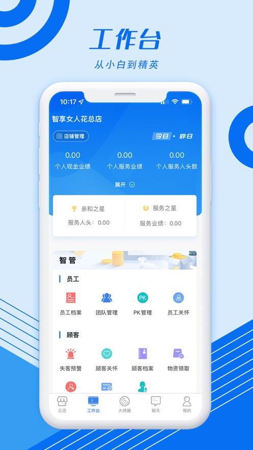 智大师app是一款店铺经营管理助手,软件拥有云店,工作台,大师圈,聊天,我的等等功能服务,可以帮助更好的高效工作,需要的朋友欢迎前来下载使用。