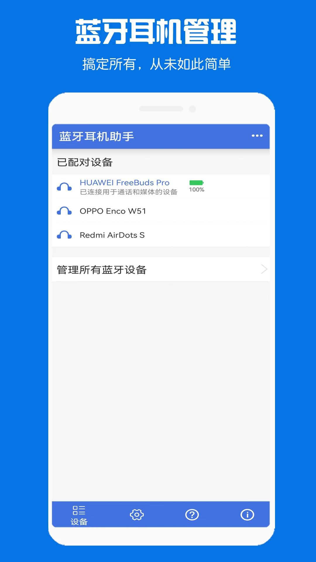 可快速对蓝牙耳机进行连接管理,并能及时快速地提示链接状态和电量信息。
