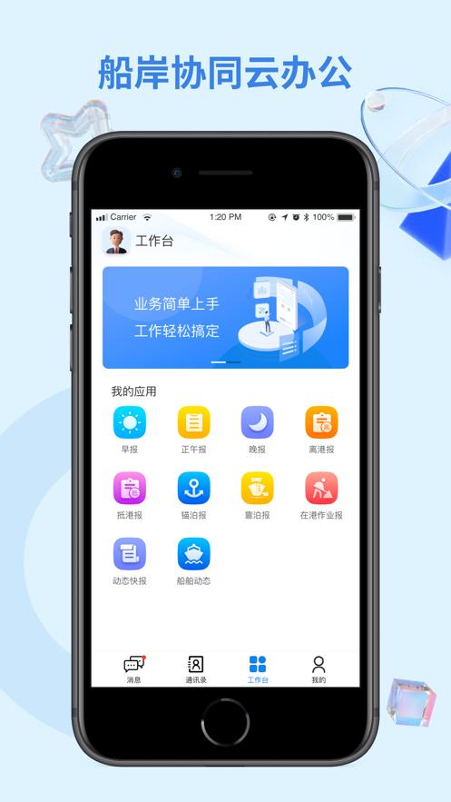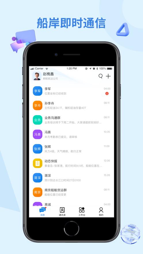 鲟航岸基端app是一款船岸一体经营管理平台,平台拥有消息,通讯录,工作台,我的等等功能板块,可以让沟通更便捷,让管理更简单。