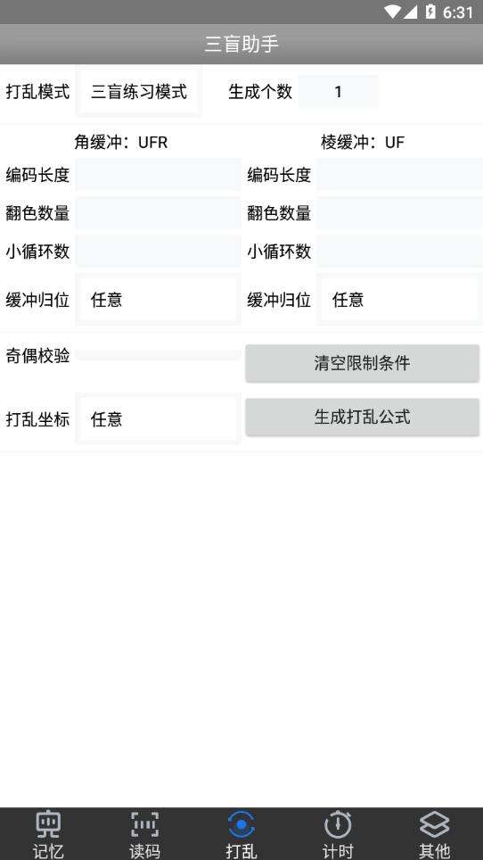 提前在设置界面设置好自己的缓冲,然后进入打乱界面。输入框不填写则表示随机项,填写多个则根据填写的条件筛选出符合条件的打乱。