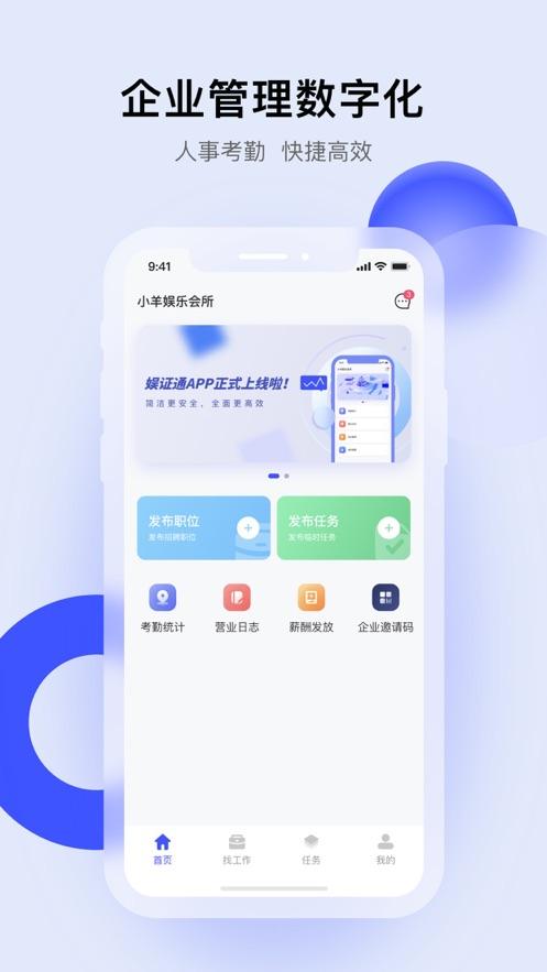 娱证通app是专为娱乐行业制作,软件拥有人事管理,考勤打卡,绩效考核,招聘管理等等丰富功能,可以帮助娱乐行业更好的经营发展。