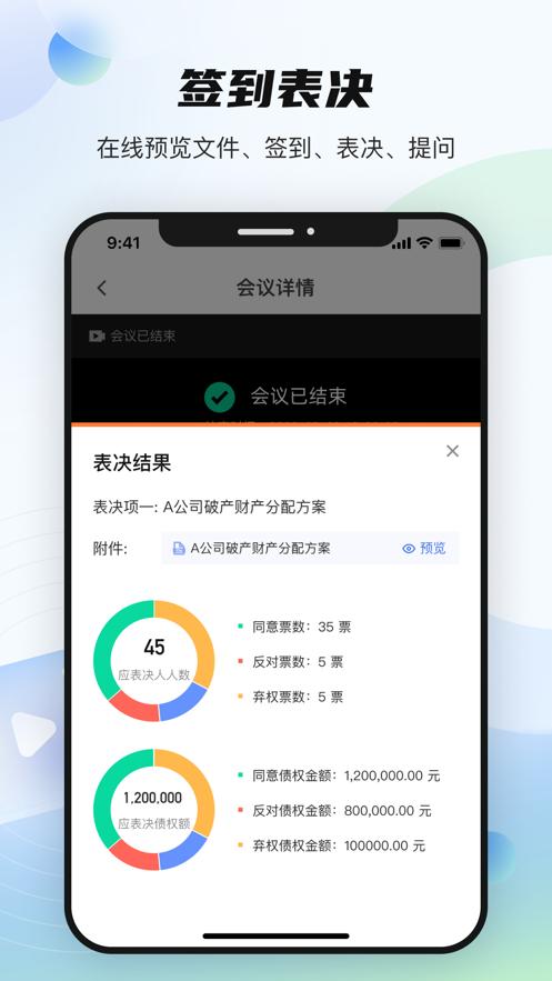 支持当事人、债权人、破产管理人和法官参加网络会议,提供会议签到、投票表决等功能。