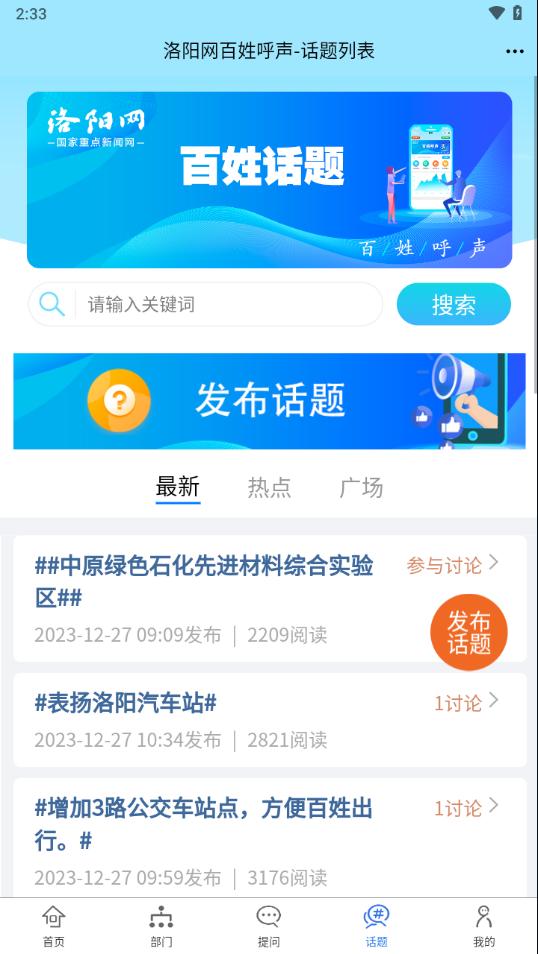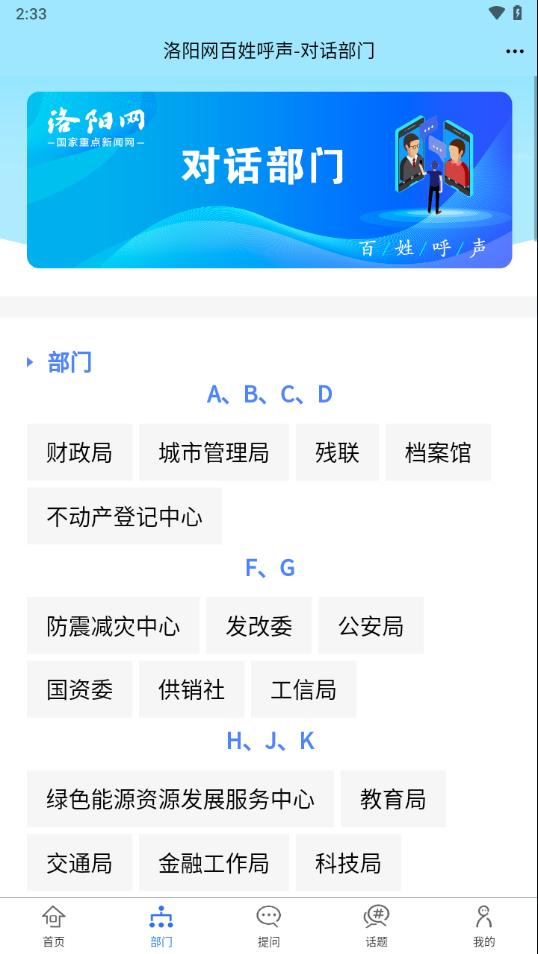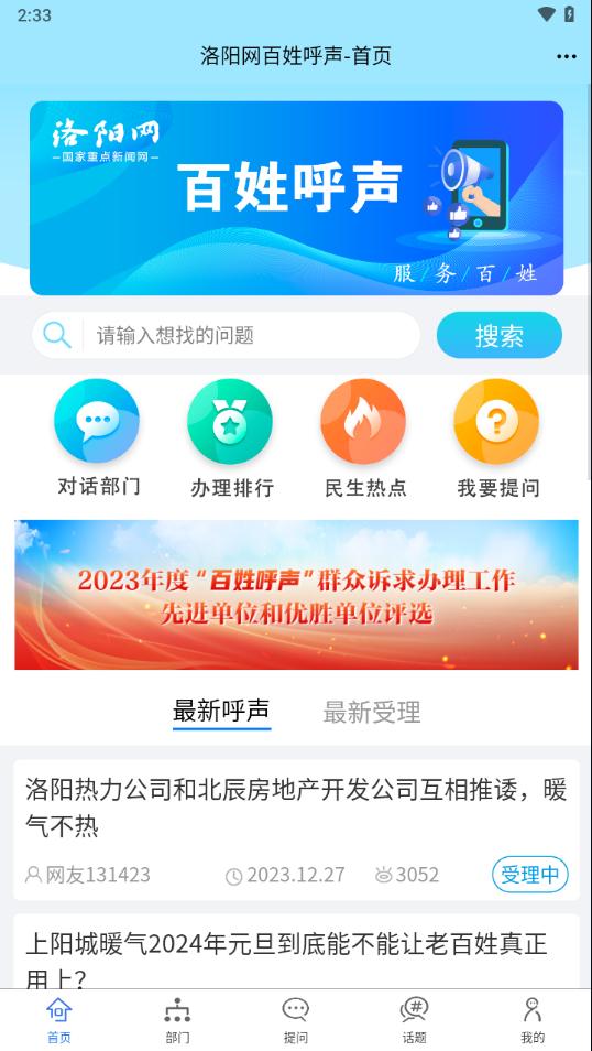百姓呼声app下载是一款洛阳综合服务平台,平台拥有首页,部门,提问,话题,我的等等功能板块,可以帮助更好的服务洛阳,需要的朋友欢迎前来下载使用。