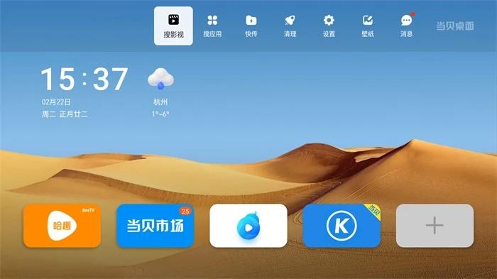桌面初始预装仅有四个应用,UI界面视觉上干净简单且功能全面,桌面首页有天气、快捷应用、和快捷导航栏,没有广告的当贝桌面4.0让体验感再升级,相比之前版本的当贝桌面,软件启动时间提升了20%