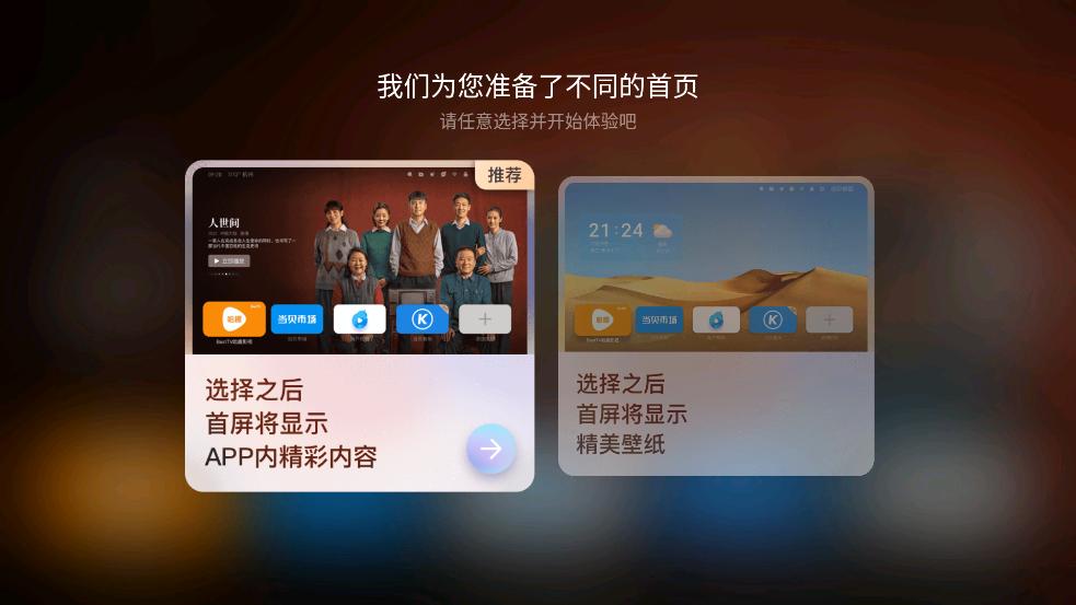 初始有两种桌面风格可以选择,一种首屏将展示APP内容精彩内容,另一种首屏将会显示精美壁纸