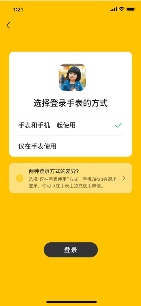 使用已有微信帐号登录手表,可选择独立使用手表。