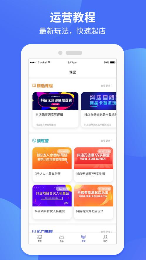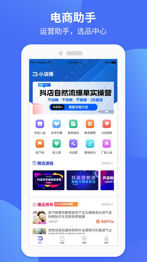 小店通app是专为广大抖音小店商家制作,软件拥有爆款选品,运营教程,开店辅导等等丰富功能,可以帮助更好的店铺经营管理,欢迎前来下载使用。