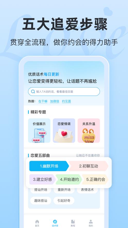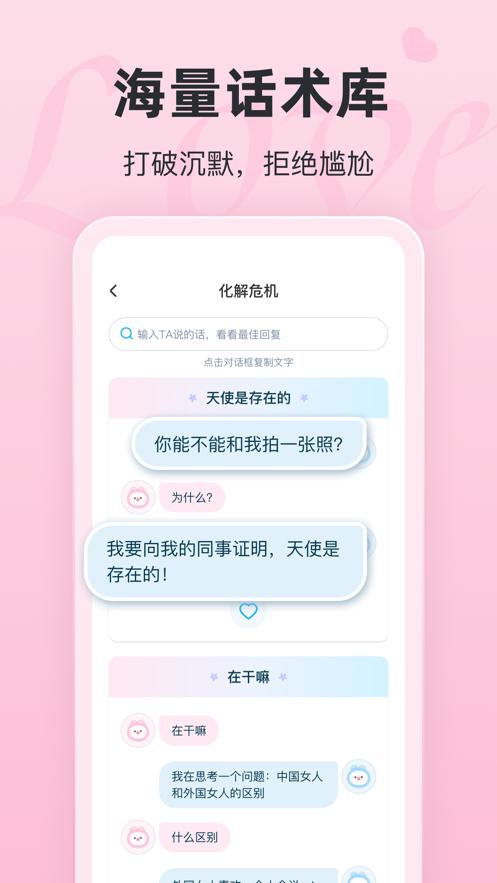 恋话宝app是聊天恋爱话术助手,软件拥有海量话术,可以一键搜索,还拥有表情包,恋话宝键盘等功能,可以帮助用户更好的聊天追爱。