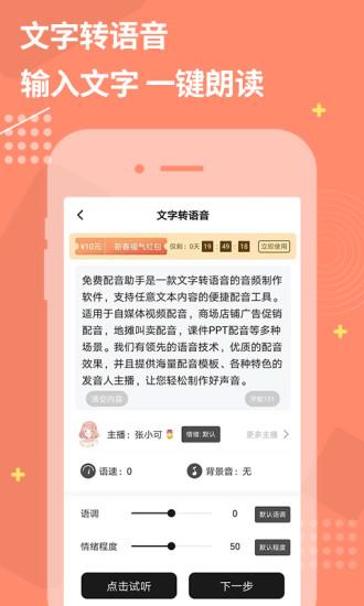 免费配音助手app是一款非常好用的精准文字转语音的配音软件,操作十分简单易上手,主要提供广告促销配音、教学课件配音、广播播报配音、自媒体视频配音、解说配音等配音服务,功能十分齐全,感兴趣的话赶紧来下载试试看吧
