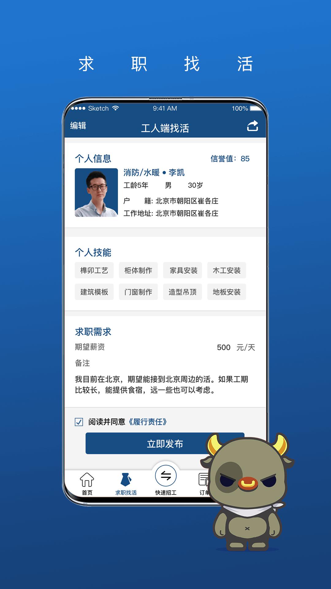 我们基于移动端APP精准的定位匹配招工需求及求职需求,为双方构建起新的人力资源管理,在发展的同时助力政府监管施工安全、工资发放等劳务保障问题。