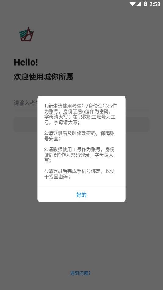 1.新生请使用考生号/身份证号码作为账号,身份证后6位作为密码字母请大写;在职教职工账号为工号,字母请大写