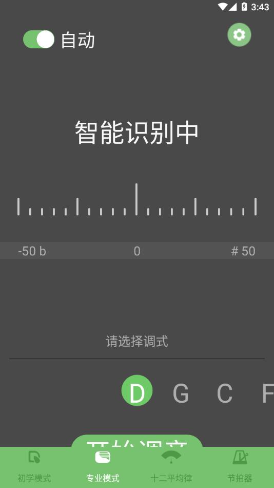 “专业模式”,可以选择D调,G调等不同的音调,同样拨动琴弦,会自动识别是那一根琴弦,准确度还是挺高的,如果音是准确的,指针应该落在绿色线左右各一小格中间。