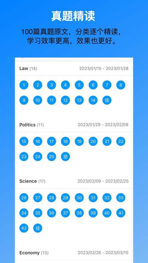 轻松高效精读完 100 篇考研真题原文,让你学透真题,轻松提分。我们将近10年的100篇真题原文,根据内容整理为8大分类。让你按分类逐步精读完100篇。在精读过程中,通过单词收藏+单词抽查,让考研重点单词一个都逃不掉。通过长难句成分解析和句子翻译,让你学会读懂长难句,阅读翻译再也不用害怕。