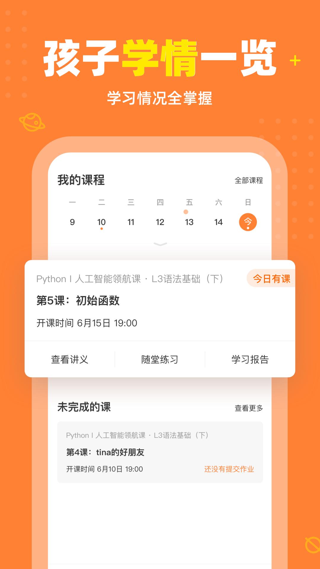 核桃编程家长端APP——通过课前上课预告、课中课堂监测、课后学情反馈,为家长提供一站式和全方位服务,让家长了解孩子在整个编程学习过程中的情况。