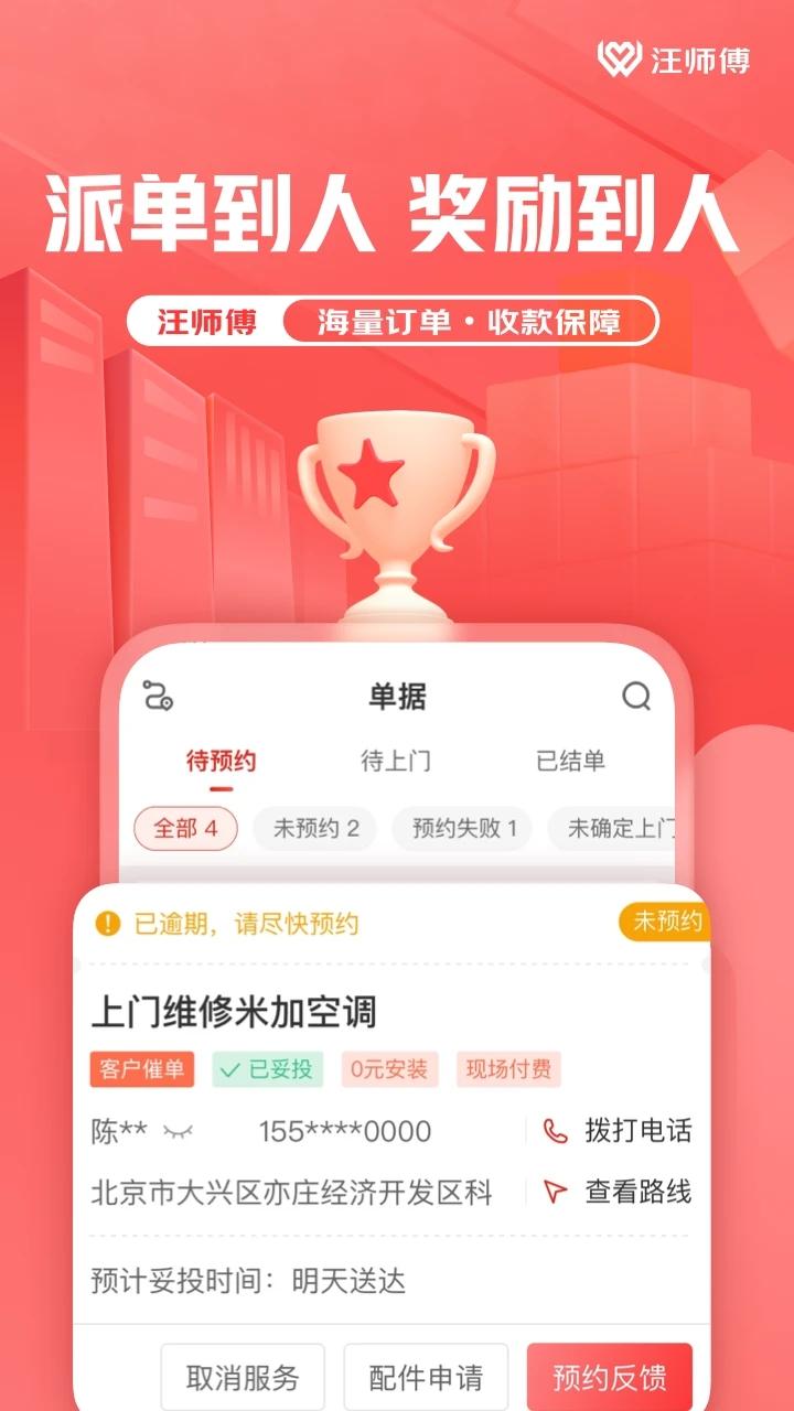 汪师傅是为网点技工师傅使用的一款接单和上门履约的移动端工具,支持联系客户、预约反馈、服务反馈等功能。