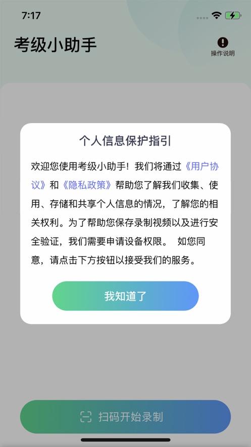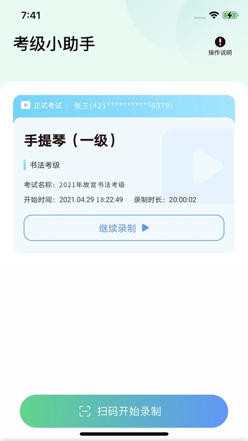 考级小助手主要是辅助在线视频考级进行双机位考试监控。考生只需扫描主机二维码,启动辅机位录制,点击确定,即可进行辅机监控录制。