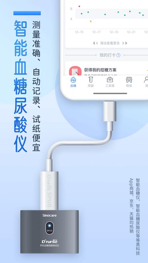 7. 搭配先进的糖护士手机血糖仪、SPUG血糖尿酸测试仪、insulinK®胰岛素剂量记录仪,测量数据可自动记录,科学管理,无限存储;