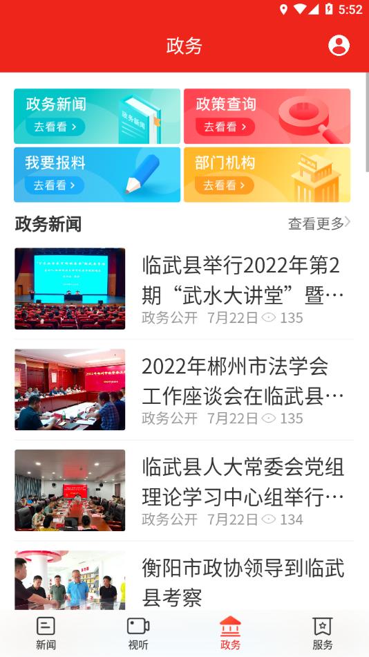 龙源临武客户端涵盖了新闻资讯、功能服务、部门单位三大版块。