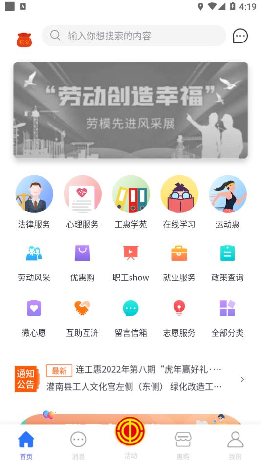 连工惠app下载安装是连云港市总工会官方倾情推出,软件拥有法律服务,心理服务,工惠学苑,在线学习,运动惠,就业服务,政策查询,消息,惠购等等丰富功能,可以给予工会会员更好的服务。