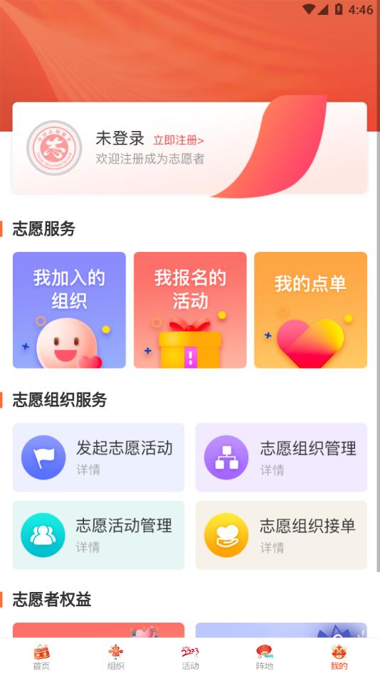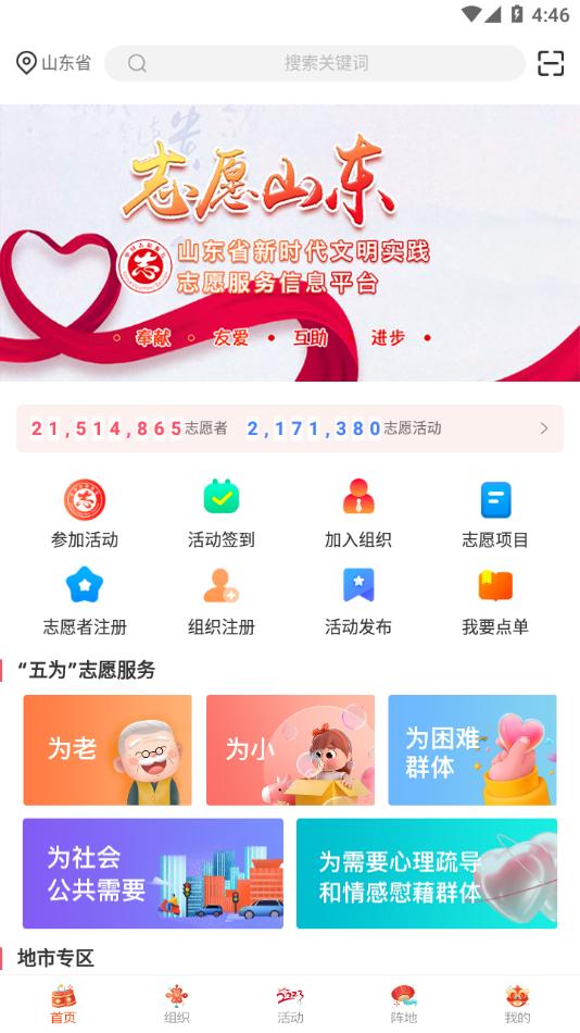志愿山东APP是专为山东制作的一站式志愿服务平台,平台拥有首页,组织,活动,阵地,我的等功能板块,可以助力更智慧志愿服务。