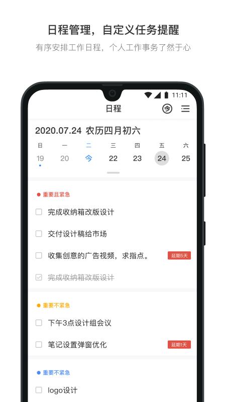 ● 日程:工作任务分轻重缓急逐一击破,日、周、月视图任意切换。 从此告别杂乱无序,开启井井有条的工作模式,帮助团队成员更好的提高工作效率。