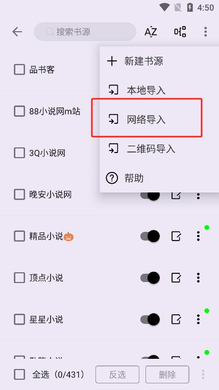 3.点击右上的“三个点”的图标,并点击“网络导入”。