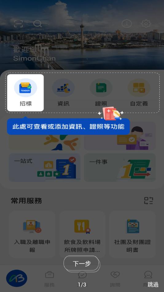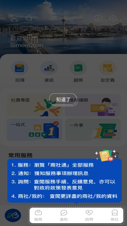 商社通app下载是澳门特别行政区政府官方倾情推出,软件拥有首页,服务,通知,访问,我的等等功能板块,可以为企业和社团提供从设立、营运到发展所需的电子化公共服务。