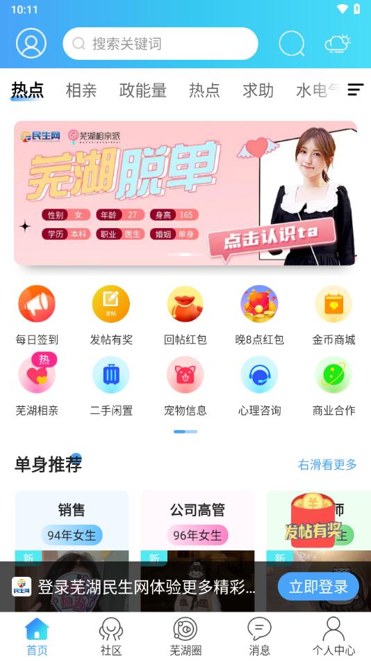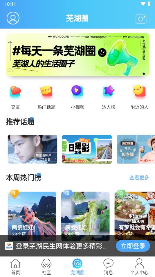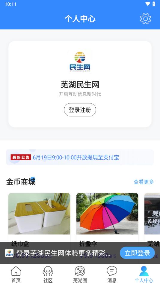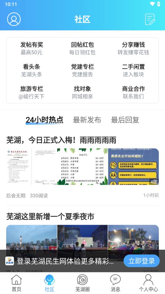 芜湖民生网app是专为芜湖制作的本地社区服务平台,平台拥有首页,社区,芜湖圈,消息,个人中心等功能板块,可以帮助用户更智慧便捷生活。