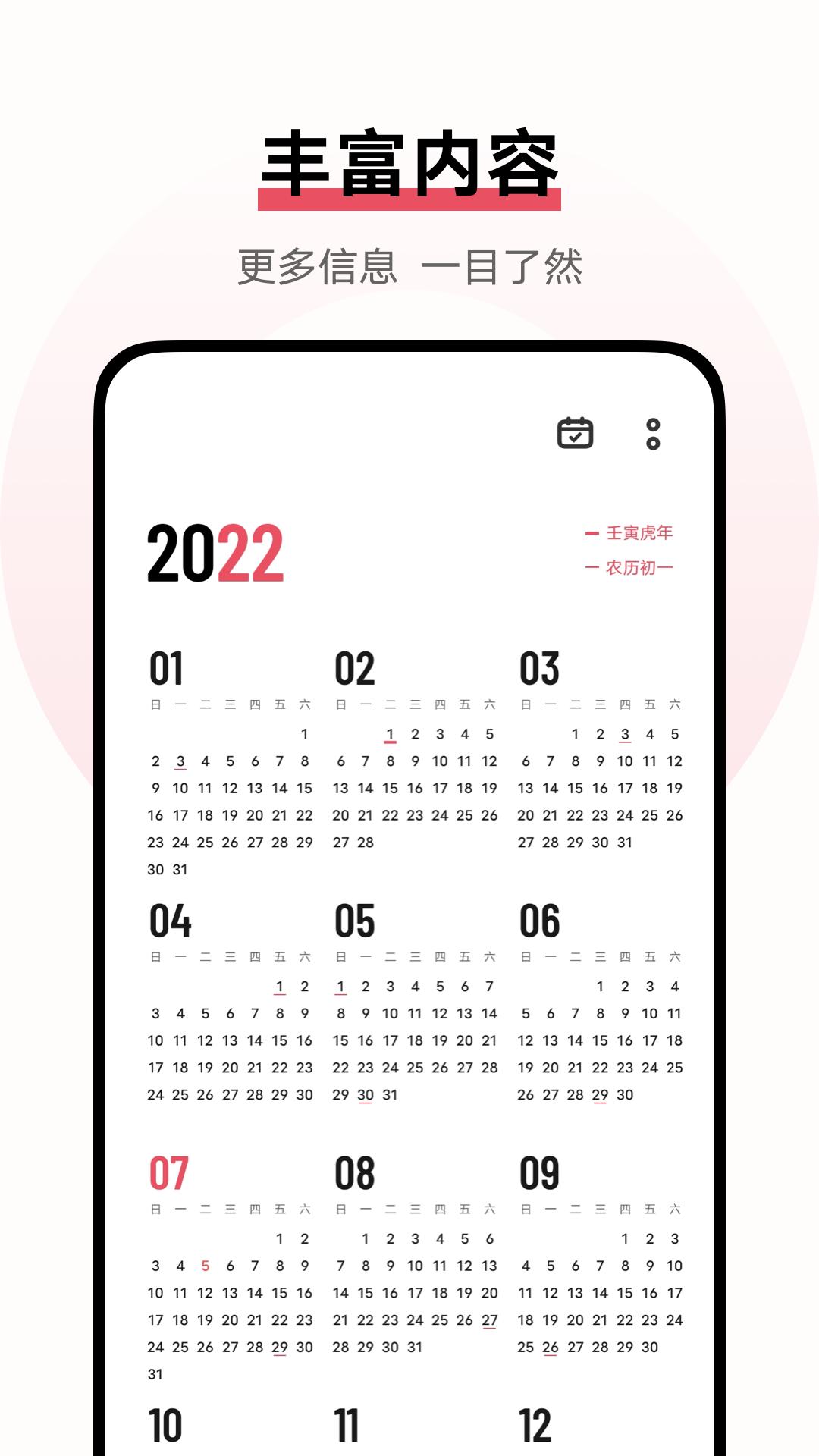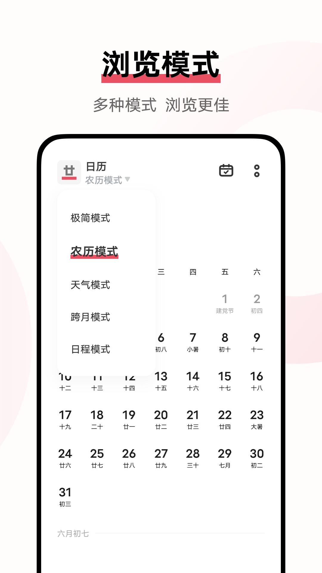 -提供极简、天气、跨月、日程、农历等5种视图模式;