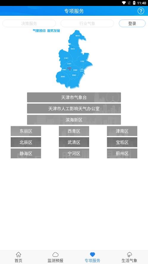 天津气象手机APP面向天津市公众、决策、专业、行业用户研发,有效地整合现有气象信息资源把气象预报、气象预警、气象服务进行统筹管理,为气象预警及服务提供有力支撑,更好的满足政府部门、专业用户和公众用户对气象的需求。