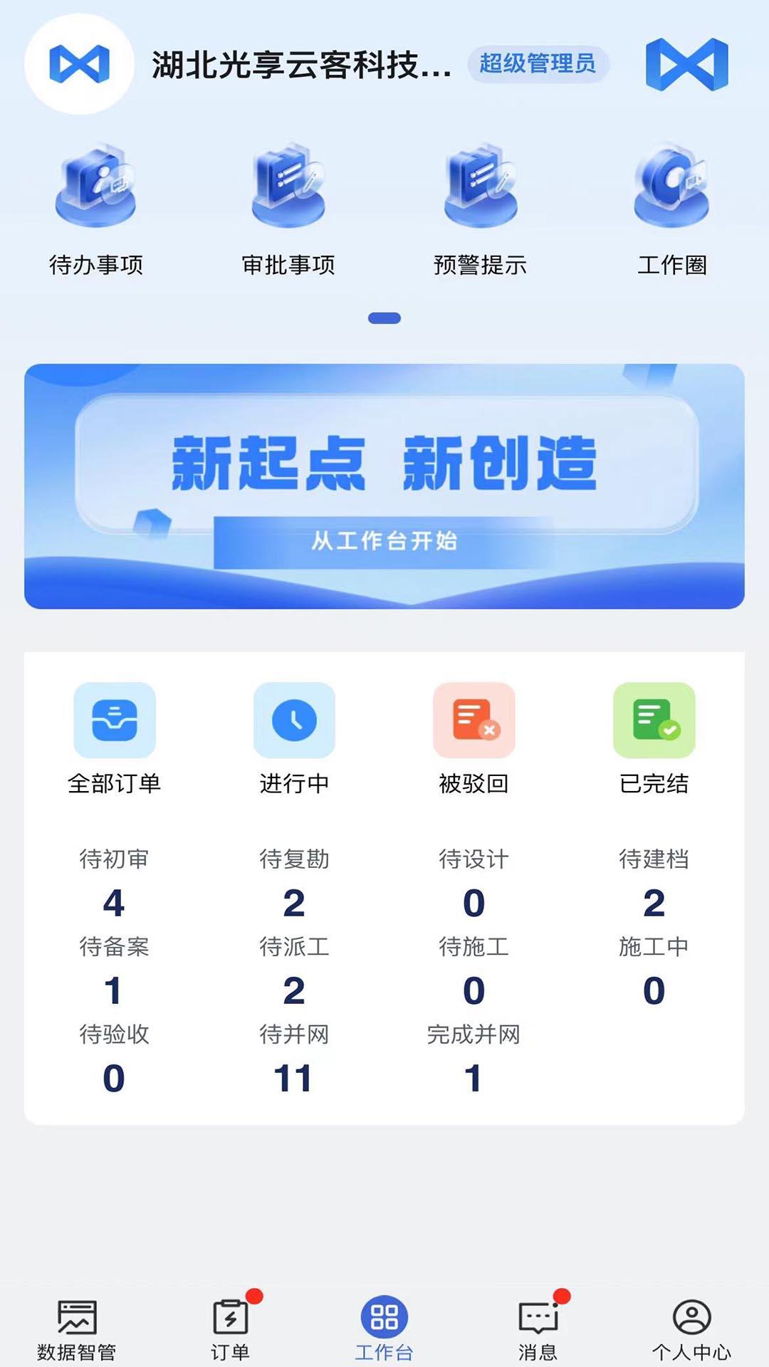 主要功能有:数据智管、订单管理、工作台、消息通知;满足光伏全流程管理中数据统计分析,订单流转、待办、预警、消息通知等一站式服务。