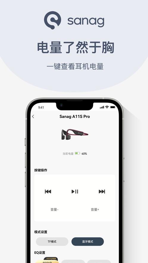 在设备连接状态下,通过Sanag APP能快速查看电量,配对等功能。