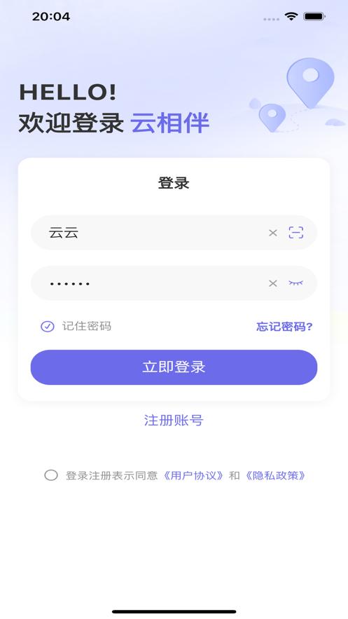 云相伴app是一款GPS卫星定位助手,软件可以帮助用户手机连接设备,实现GPS定位,电子围栏,轨迹回放等等功能,需要的朋友欢迎前来下载使用。