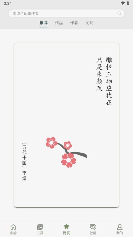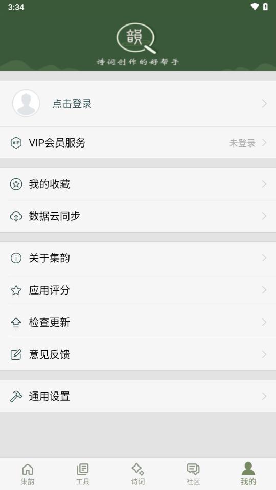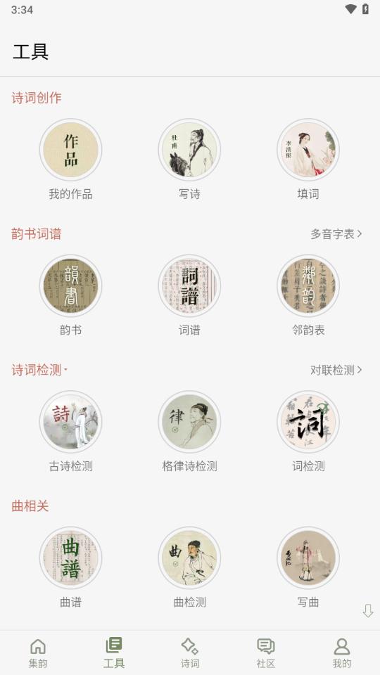诗词集韵app是一款诗词学习软件,软件拥有集韵,工具,诗词,社区,我的等等功能板块,可以帮助用户更好的诗词学习及创作,觉得不错的朋友欢迎前来下载使用。
