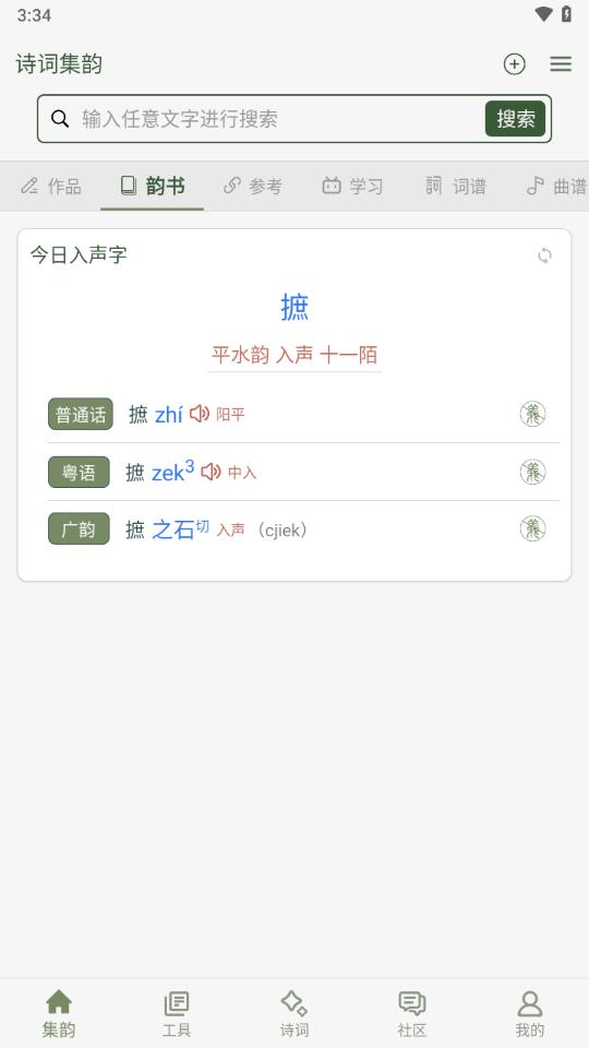 诗词集韵支持古诗、格律诗、词和曲的检测和创建作品,可以查询搜索包括普通话、粤语、广韵、朝日越等语言的发音并可应用于诗词曲检测,